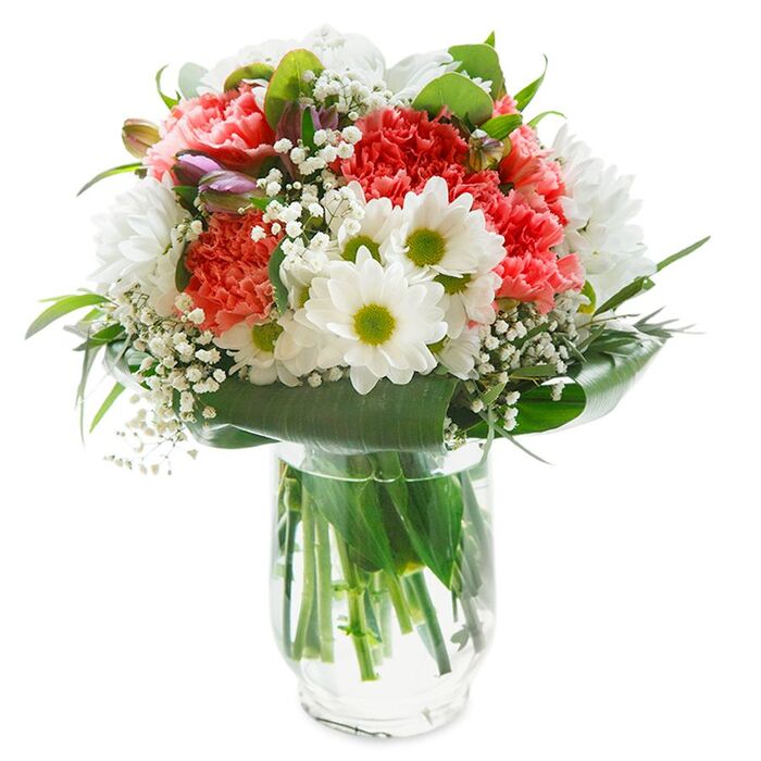 Celebrate life's moments with this graceful bouquet, combining white chrysanthemums, airy gypsophila, soft light pink carnations, and vibrant aspidistra leaves. Each flower is hand-selected to guarantee exceptional freshness and lasting beauty.